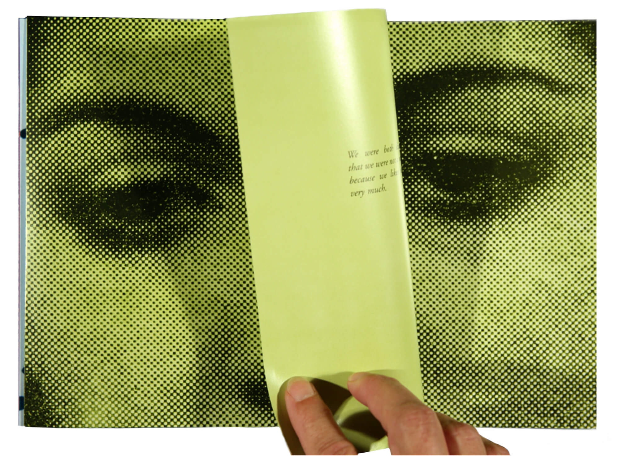 moment —they can see the right half of the woman’s face on the next page, and a complete face is visible. But after the page has been turned, on the left side we read “We were both disappointed that we were not a matched set because we liked each other very much.” To the right we see half of a face. The potential for wholeness proves to be allusive.